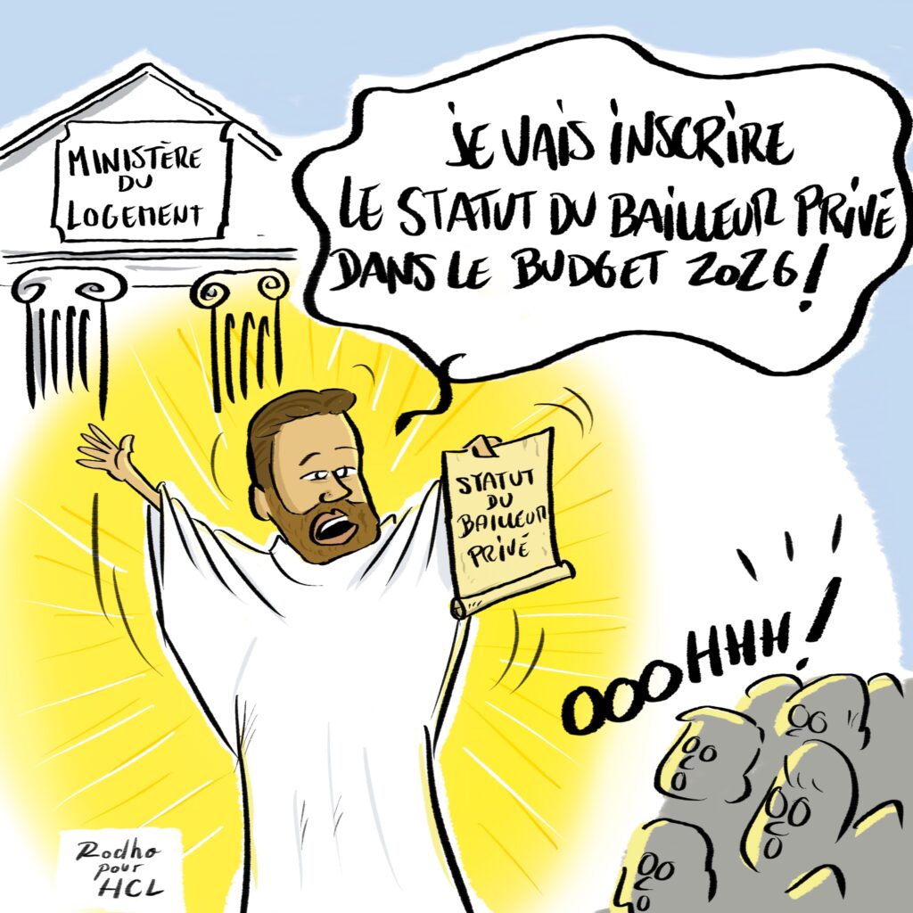 On n’oublie pas que toutes les organisations professionnelles du secteur (ou presque), craignant son abandon, demandaient, suppliaient à cor et à cri que le fameux statut du bailleur privé, promis par Valérie Létard (sans qu’on en connaisse précisément les détails d’ailleurs) ne passe pas à la trappe. Et bien voilà, le nouveau ministre promet de l’introduire par amendement gouvernemental lors du prochain débat budgétaire. Et ce contentement, cet empressement d’étonner même le crayon du dessinateur de presse.