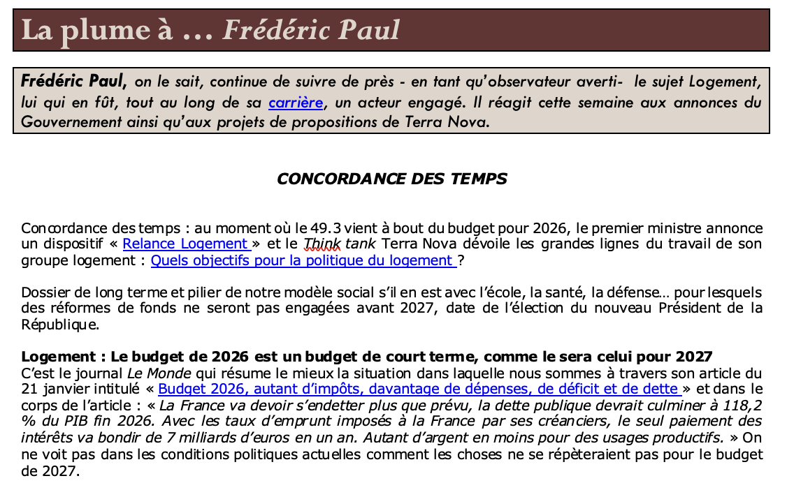 Politique Logement « Concordance des temps »… Une tribune de Frédéric Paul ( tiré-à-part Lettre HCL 795) 30 janvier 2026